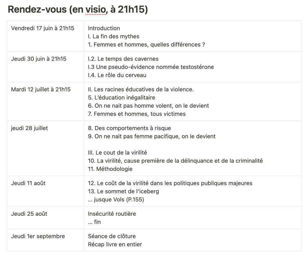 - il faut avoir lu le chapitre / livre concerné. Ceci afin d’avoir les mêmes infos en tête et des échanges utiles et ne pas poser des questions dont les réponses sont dans le livre. Un club de lecture où une seule personne a lu le livre n’est pas de même qualité