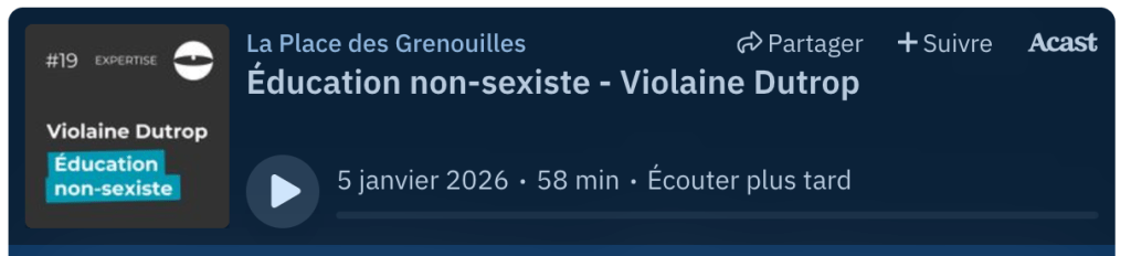 Dans ce volet expertise, nous recevons Violaine Dutrop, fondatrice de l’institut EgaliGone et autrice des essais Le pouvoir insidieux du genre, ainsi que de Maternité, Paternité, Parité. Elle fait partie du collectif auteur de Nos Enfants, nous-mêmes, un manuel de parentalité féministe, avec Lucie Beguin, Perrine Benoist, Anaïs Le Brun-Berry, Laetitia Latapy, Héloïse Simon et Goundo Diawara, et avec la participation de Fatimata Diagana.